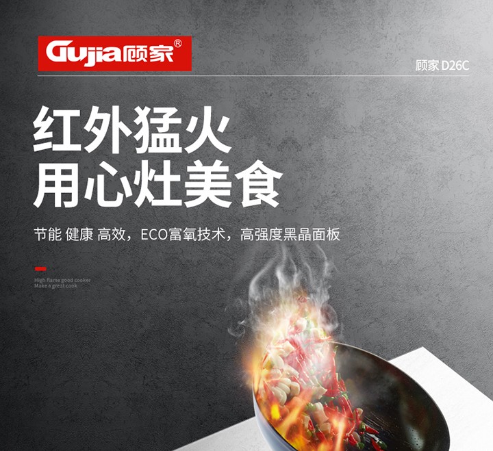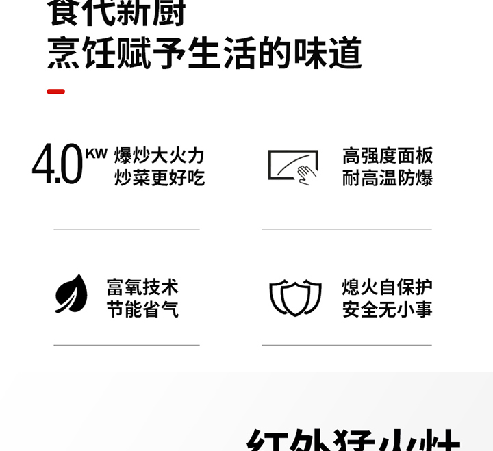 核心卖点:红外线燃烧技术,明火不黑锅、更高效、节能,健康